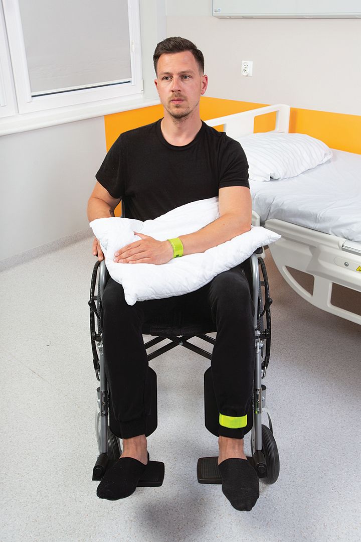 Ręka oraz noga dotknięte udarem zostały oznaczone poprzez odblaskowe opaski.