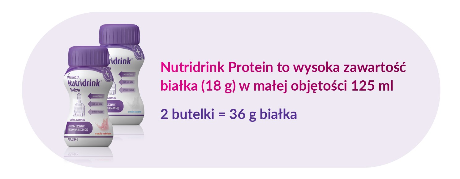 Warto pamiętać, że właściwe podawanie preparatów do żywienia medycznego (np. Nutridrink Protein) wiąże się z pewnymi zasadami, w tym m.in. odpowiednim sposobem i czasem wypijania. Należy je pić małymi łykami, najlepiej około 30 minut. Dla urozmaicenia można rozważyć włączenie ich do gotowych potraw, np. zastąpić część jogurtu w koktajlu, śmietanę w zupie krem, dodać do twarogu i przygotować nadzienie do naleśników, bądź rozlać do małych pojemniczków i przyrządzić lody. Możliwości jest naprawdę wiele: przepisy znajdziesz na stronie pwch.you2.pl. Nutridrink Protein to żywność specjalnego przeznaczenia medycznego. Do postępowania dietetycznego w niedożywieniu i ryzyku niedożywienia związanym z chorobą, szczególnie u pacjentów ze zwiększonym zapotrzebowaniem białkowym. Stosować pod nadzorem lekarza.